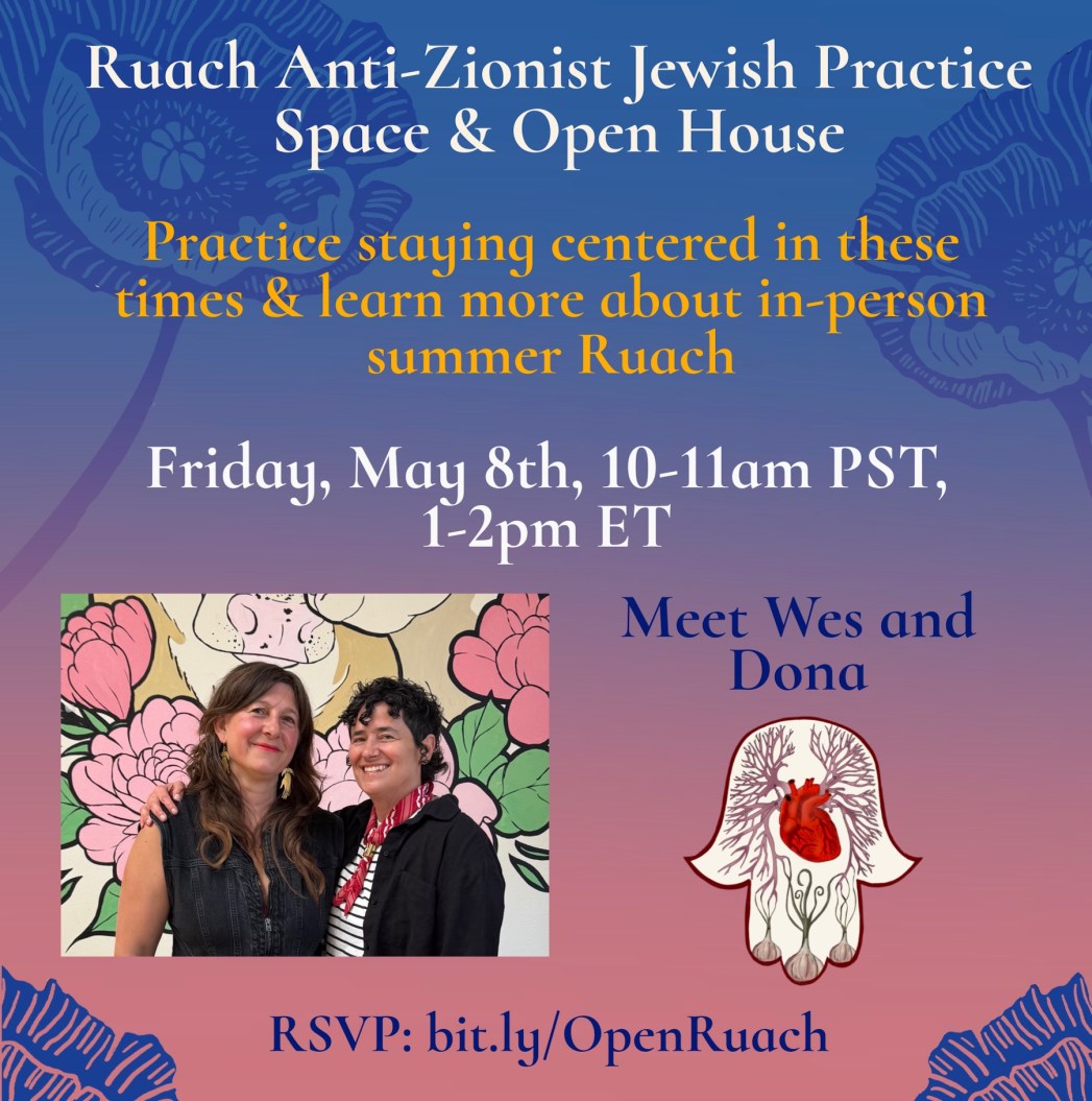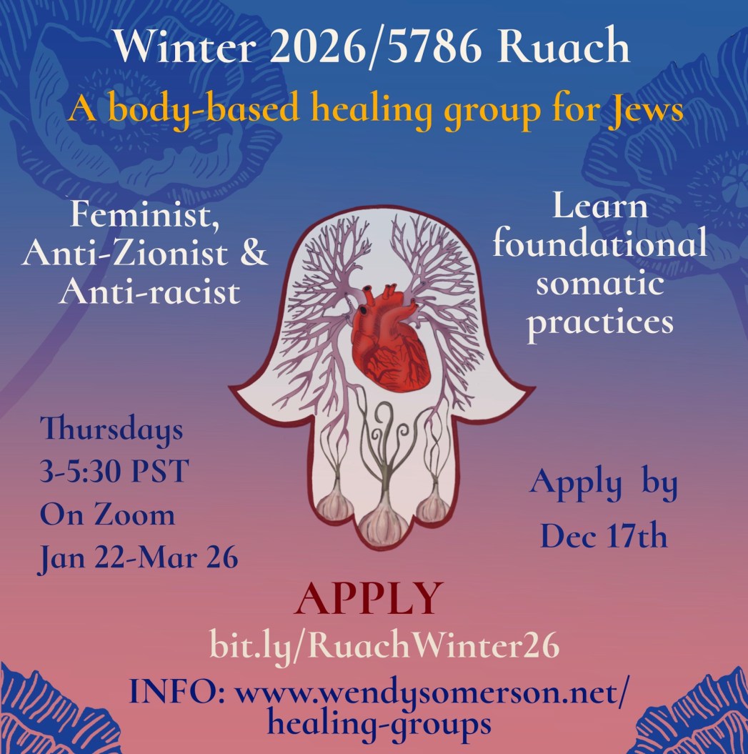 Ruach means breath/spirit in Hebrew. Ruach is a Jewish body-based healing group for anti-Zionist Jews that Wes has been running since 2021 both online and in person in the Pacific Northwest. Dona Hirschfield-White joined the Ruach facilitation team in 2023.